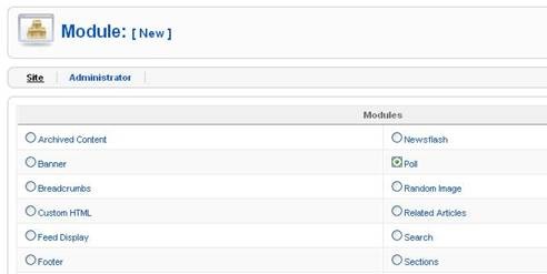 Now let add Poll module to the site. Go to Extensions -> Module manager and click New button at the top of the page.