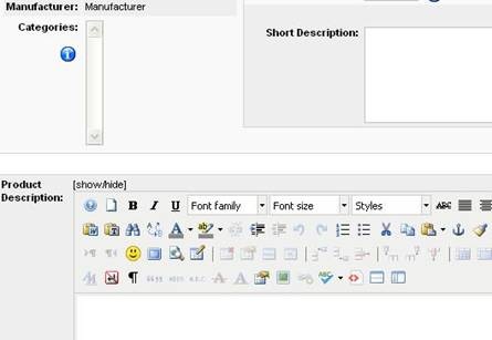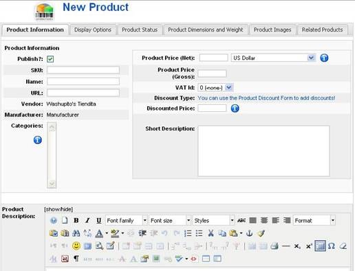 4. In order to successfully create a new product, we must enter at least the SKU, name, and product price, and assign the product to at least on category (you can create more categories by pressing "Product">"Add Category" from the Virtuemart navigation bar.)