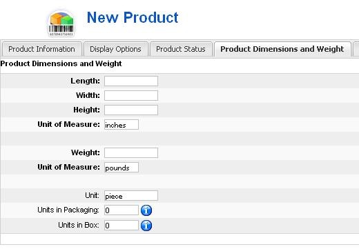 7. Next, we select the Product Dimensions and Weight tab. We enter the length, width, and height, weight, and units of measure: