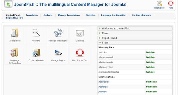 Within the State area, carefully view Directory State and Extension State. This shows the state of all directories required for working with this component (should be writeable for stable working) and state of additional extensions that are auxiliary for Joom!Fish and are installed from the same package.