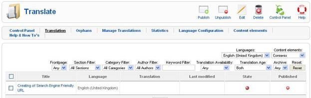 Note: Besides content translation, Joomla allows to translate title, aliases and other labels for the selected element.