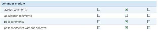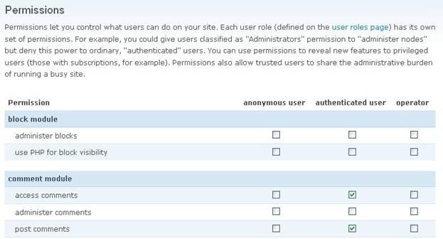 How do we go about setting up the required permissions for some user? Look down the list of permissions shown on the Permission page and find options that are related to the created user role (i our example, ability to leave comments for authenticated users):
