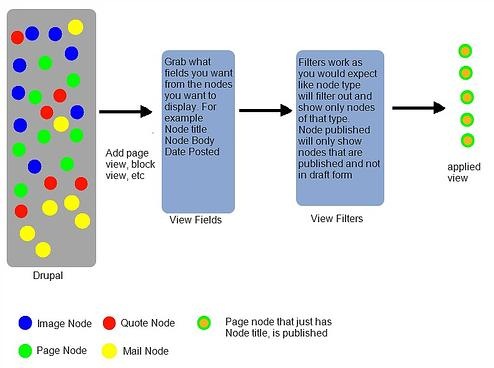 Hopefully after reading this tutorial you now get the big, “Ahh-ha, that’s how views works”. And suggestions are welcome. Keep in mind this was meant to be a very basic tutorial and in no way shows off the true power of views. More and more modules everyday are integrating with views. Once you get a basic understanding it isn’t hard to start using and learning everything views is capable of. Below is a figure of how the view basically works after we have added everything.