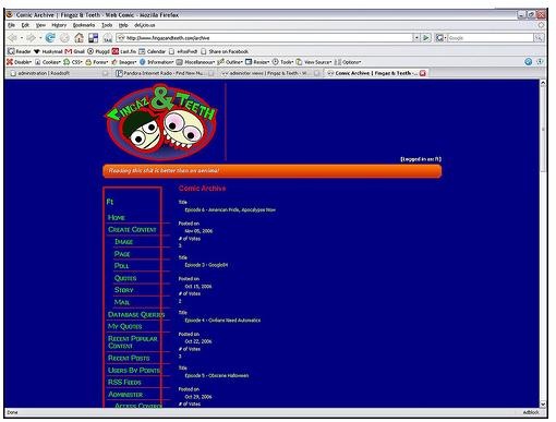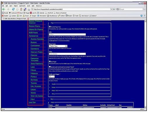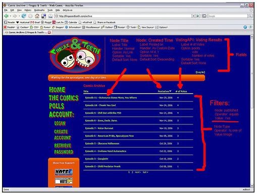 So in my example I am using a table view. We select table view from the pull down menu. Now you can give the page a title if you’d like here. I called mine ‘comic archive’, you can see figure 1 to see what it actually looks like. Also I am going to check the “user pager” box, what this will do is add pagination to my view, and I can set the “nodes per page”, which is 10 in this example. If my “user pager” is checked and I have more than 10 nodes (or comics in my instance) then it will add a next page to the bottom of the view (see figure 2). You will also notice the next sections like header, footer, empty text, and menu. For this basic tutorial you do not need them. They are pretty straight forward though, you can insert custom HTML in them if you want, if say to display an image banner, flash banner, etc. Empty text is what is what is displayed if your view doesn’t find any nodes; say for instance I didn’t have any comics, then this it what would be displayed. See figure 6 to see how what I explained above is done.