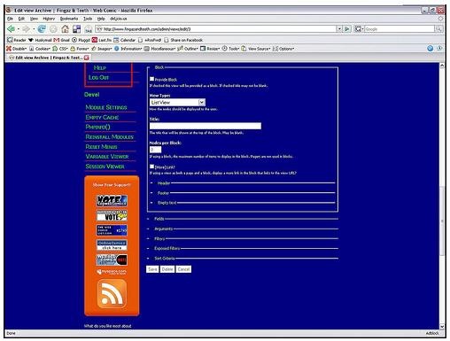 Now the block section is pretty straight forward as well. It’s used to create a block, say if I wanted to show the latest 3 comics in a block below my main menu I could. In my example I am not using it but if you wanted to you could check the “provide block” checkbox. You will also notice there is the same pull down list of view type and they function the same as described above. Nodes per block will do exactly what it says and if I wanted to show my latest 3 comics I would enter in 3. The [more] link checkbox is used in conjunction with the page view, in that say I had wanted to show my latest 3 comics but I really had 12 comics I would check this box and it would add a more link, which would link to the page view. Header, footer, and empty text function the same way as the page view. See figure 7 to see how what the block section looks like.
