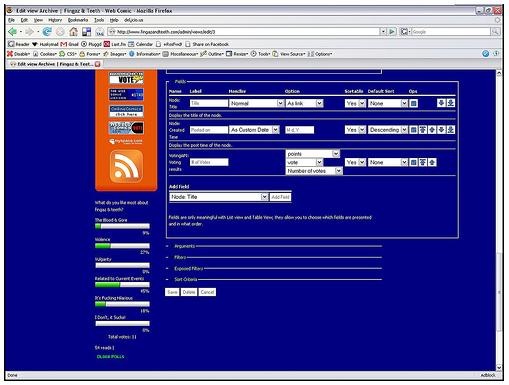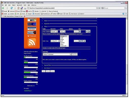 Now we want to decide how we want the view to be displayed. There is a page view and a block view. We will discuss a page view first. The page view will give use a URL that we can visit and will display the nodes we specify. In my example the URL is /archive/ so I will check the “provide page view” block. I will then specify the URL (see the address bar in figure 2), which will just be ‘archive’ in my example. Next we have to pick a view type. There is a list view, table view, teaser list view, and Full Node view. A list view will show a list given the fields you specify in the next section, for example we could show my archive as a list view (see figure 5) or as I want it a table view (see figure 1). The teaser list view is a just a list but shortens things up by making them teasers which might be useful in some applications. Full node view will show the node as is, and the fields section has no effect on it, it just shows a list (specified by your filters) of all the nodes.